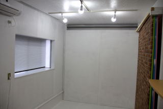 自然光のみ 自然光のみ。 ![]() 窓側の部屋の天井は、カーテンレール用の窪みがあり、そこの布を引っ掛けて、天井・壁面・床に背景布をたらすことが可能です。 カーテンレールだけでなく、tyっパリ棒を取り付けてあります。 |
