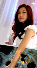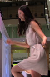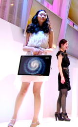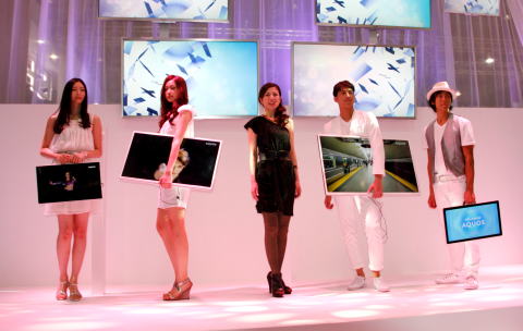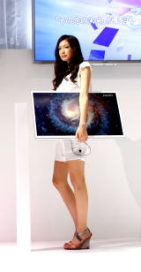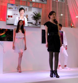 シャープの液晶テレビが、ケーブルをワイヤレスにすることにより、家の中で設置場所を選ばず、簡単に移送できることを示すステージ。