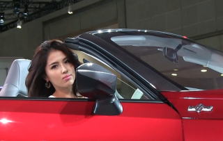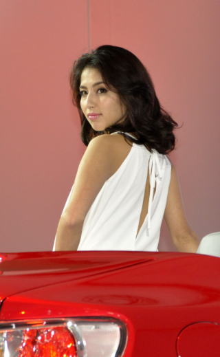 赤いオープンカーを運転した美人コンパニオン・美人モデル アップの写真・画像
