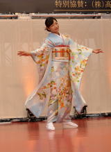 着物モデル番号5 登場順番17番 水色の着物、ピンクの帯、会場を動き回る 撮影者 ファイン・メディア・コンテンツ・ジャパン=ポートレート・スタジオ・ファイン