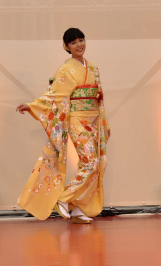 千總の京友禅 着物モデル番号8 登場順番6番 黄色の着物、緑の帯