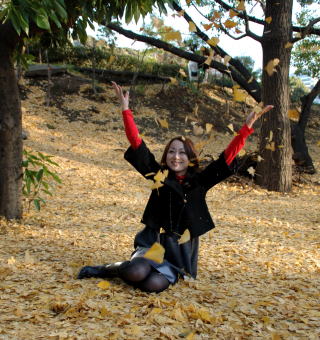 毎年恒例の落ち葉吹雪です。こつは多くの落ち葉を高くカメラマンにかけるくらいに前の方に飛ばすことです。写真には銀杏の落ち葉が大きく写ります。