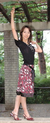 片方は立ち、片方は後ろの柱をけっている。右手は伸ばし、左手は顔に添えている。